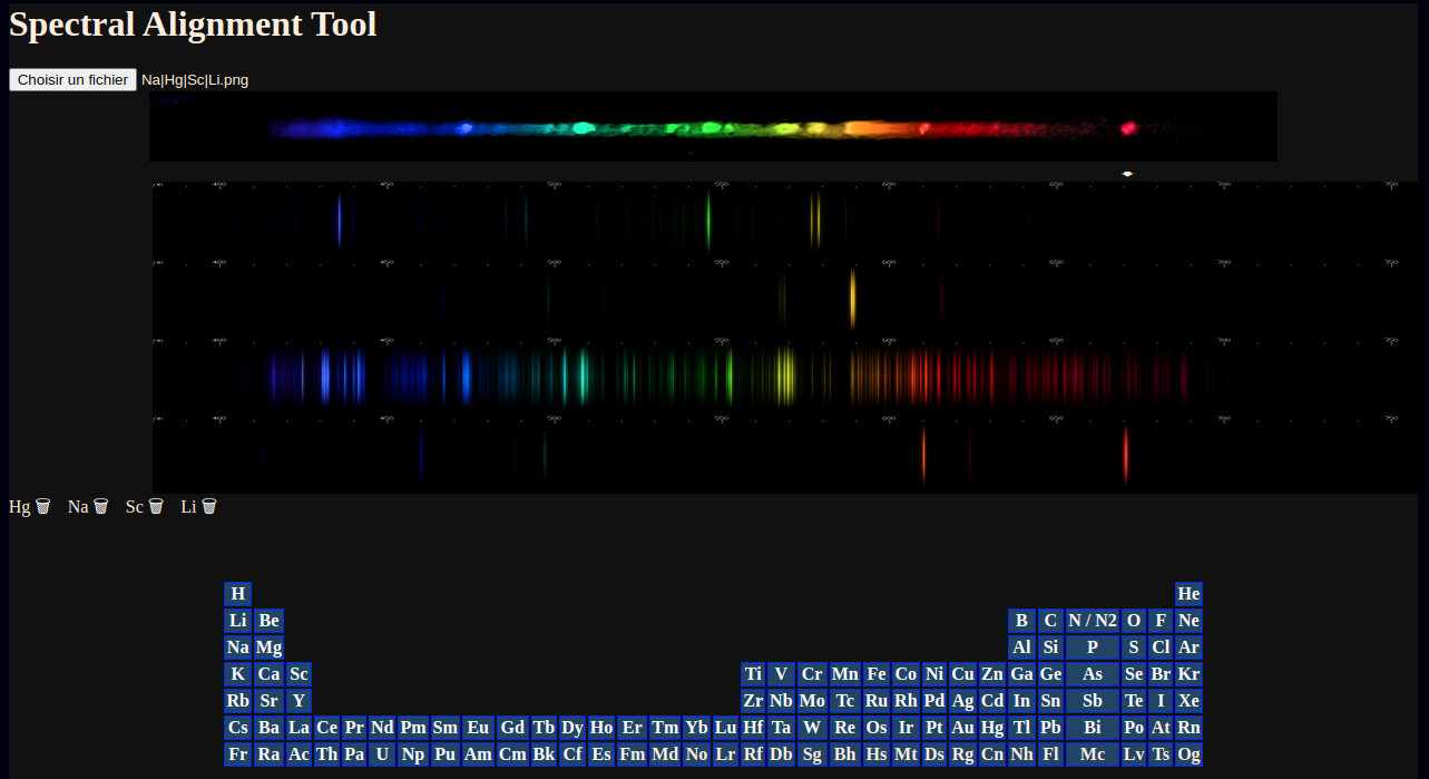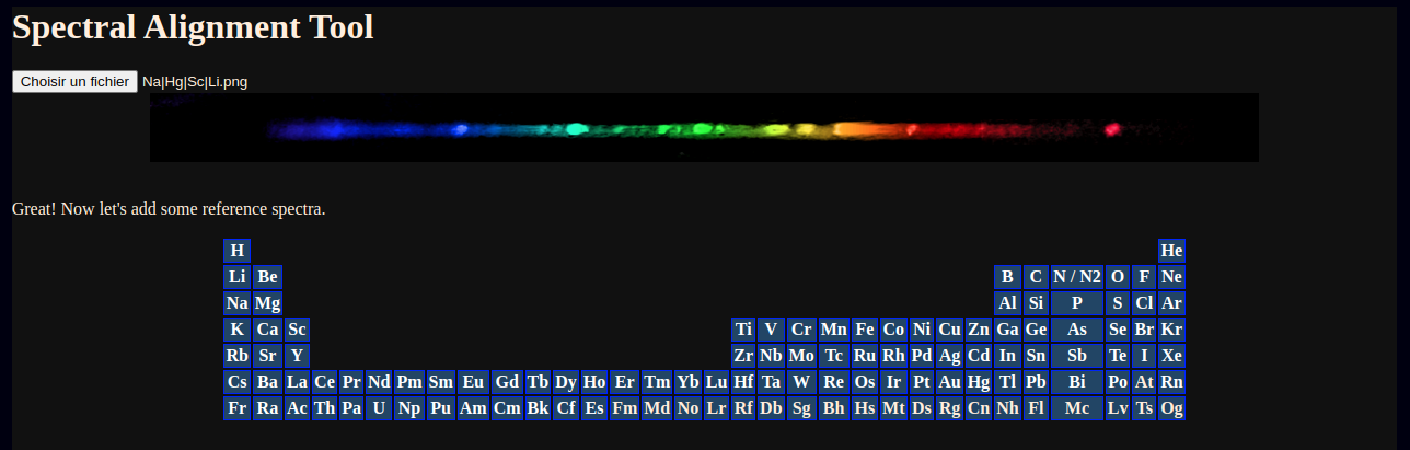 After selecting a photograph of the spectrum of a metal halide lamp, a periodic table appears allowing selection of unlimited elements for alignment.