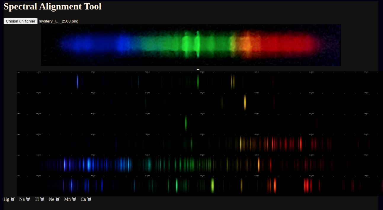 I am proud to introduce a new utility that you can use to identify spectral lines in a photo of a spectrum of an element mixture. While individual elements on their own are often easy to identify by their distinctive patterns of color and spacing, mixtures complicate this by introducing lines that break up and obscure those patterns. That's where this new utility comes in handy.