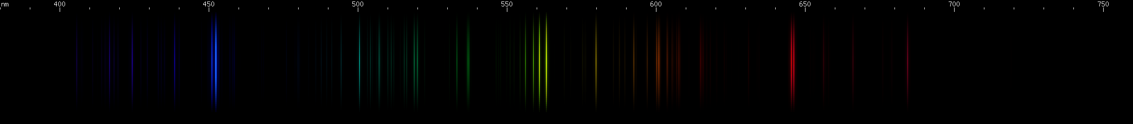 Lead: The strong lines at 406nm deep violet and 561nm yellow-green are lead's most distinguishing features. The teal grouping near 504nm also helps identify lead, along with the pattern of green lines between it and the strong yellow-green line. The strong red line is at 666nm, perhaps fittingly for such a toxic element; it stands alone, with no other prominent red lines. There is a pattern of yellow and orange lines, and a pattern of blue-violet lines.